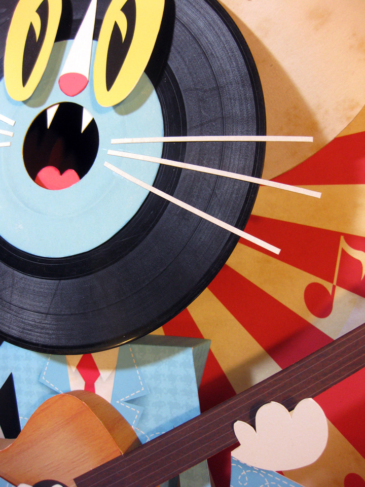 Nashville Cat. Paper sculpture with a 45 rpm record in an 11" x 14 wood shadow box. Individually numbered limited edition of 10. Each one cut by hand, assembled and signed by the artist, printed on archival paper w/ archival inks. Available here.