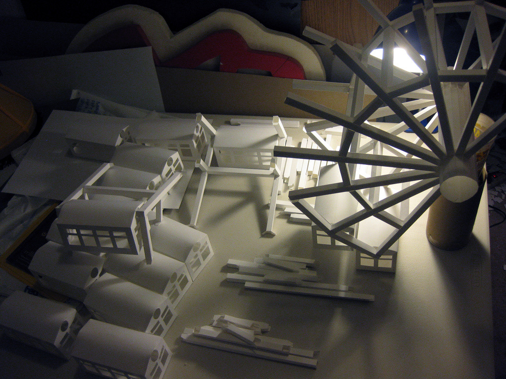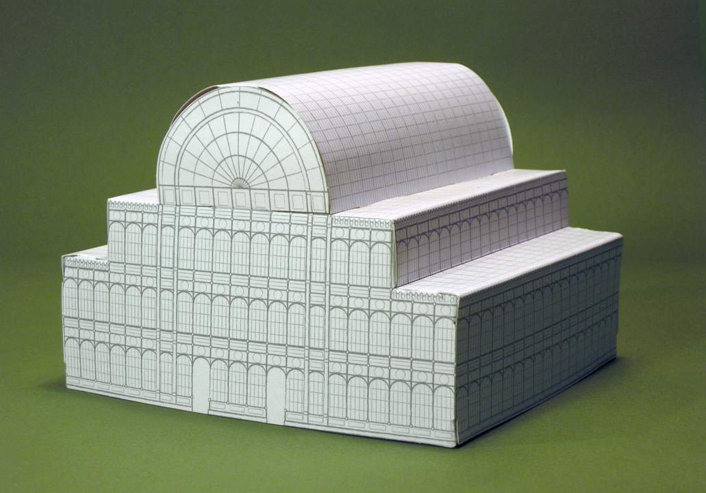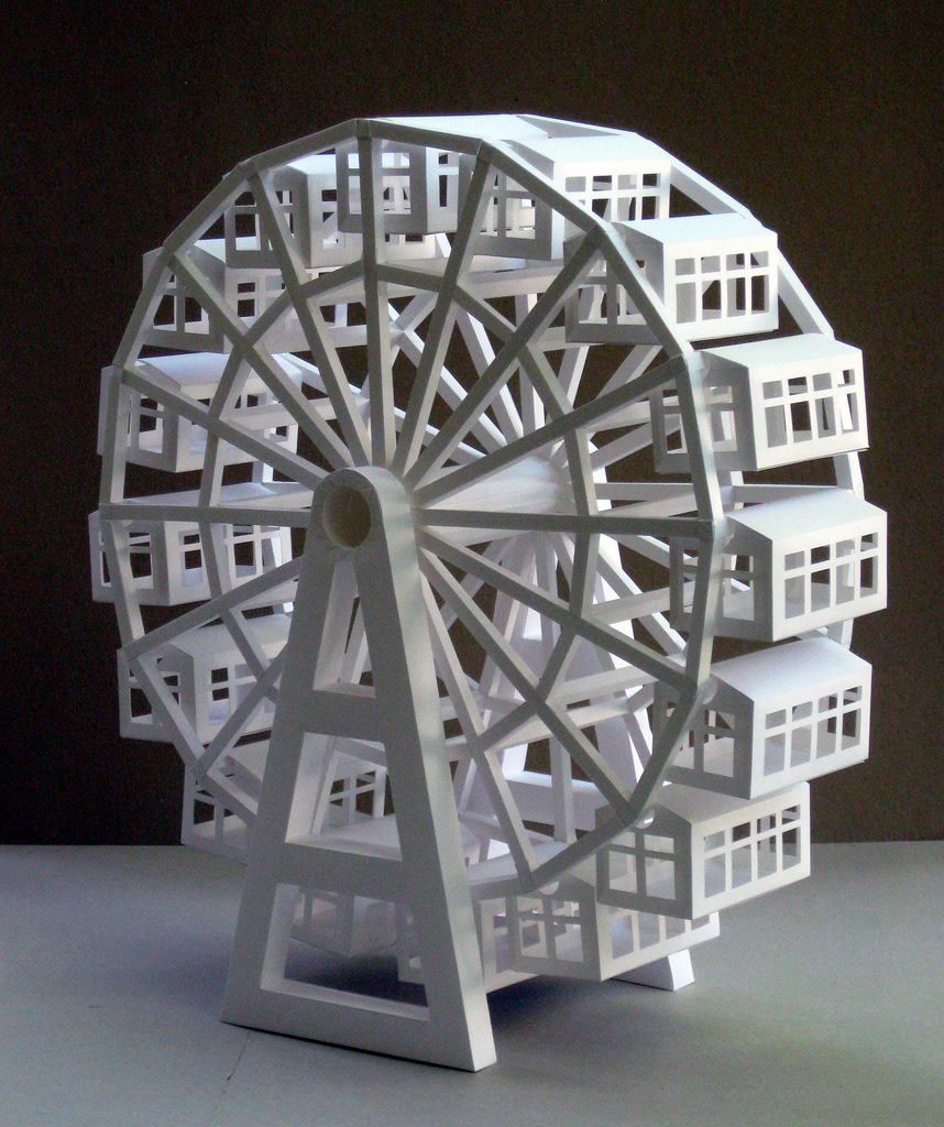 I had the pleasure of making a couple of interactive paper pieces for the youth program at The Nelson-Atkins Art Museum to go along with their new exhibit Decorative Arts of the Worlds Fair 1851-1939! We made a little paper replica of the entrance to the Crystal Palace from the 1851 Worlds Fair that kids can punch out, color and construct. No scissors or glue necessary. I also got to make a fun 2 foot tall working model of a Ferris Wheel.